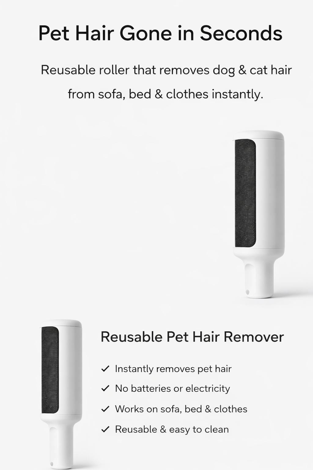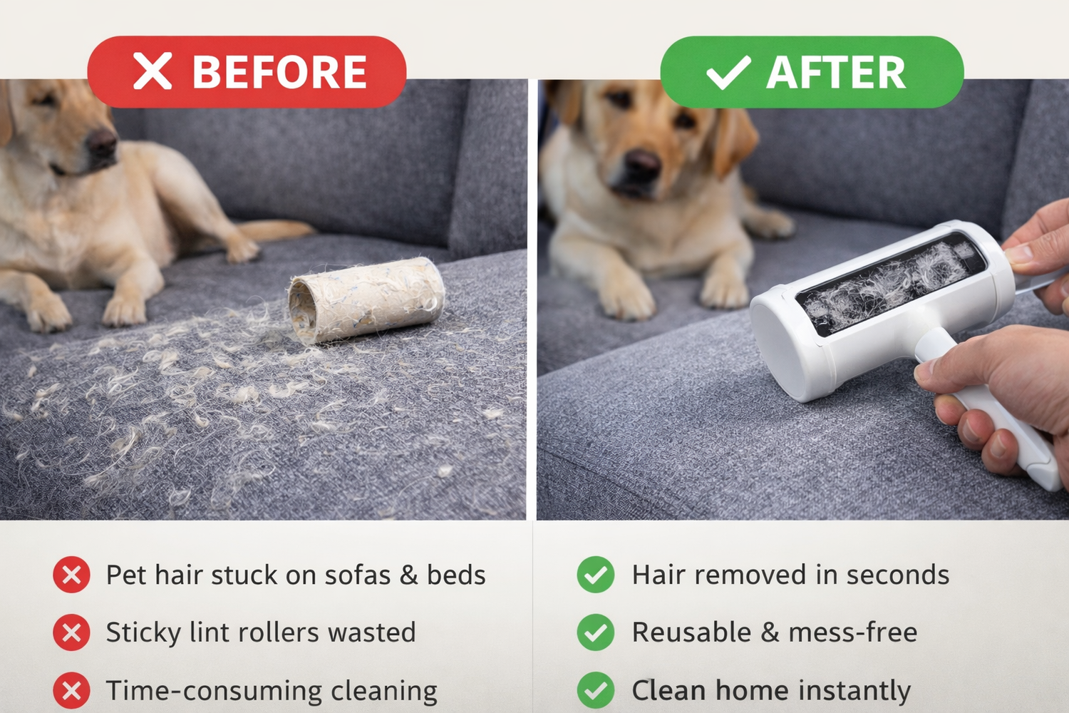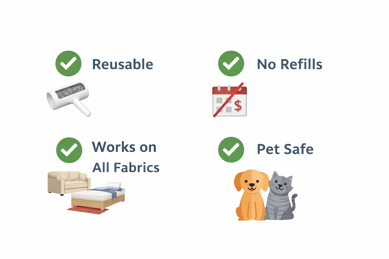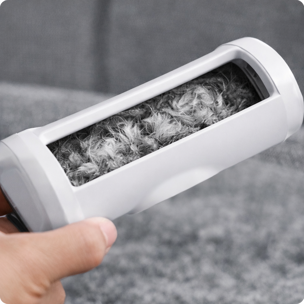 Our reusable pet hair remover lifts hair instantly from sofas, beds, and clothes — without refills, mess, or effort.